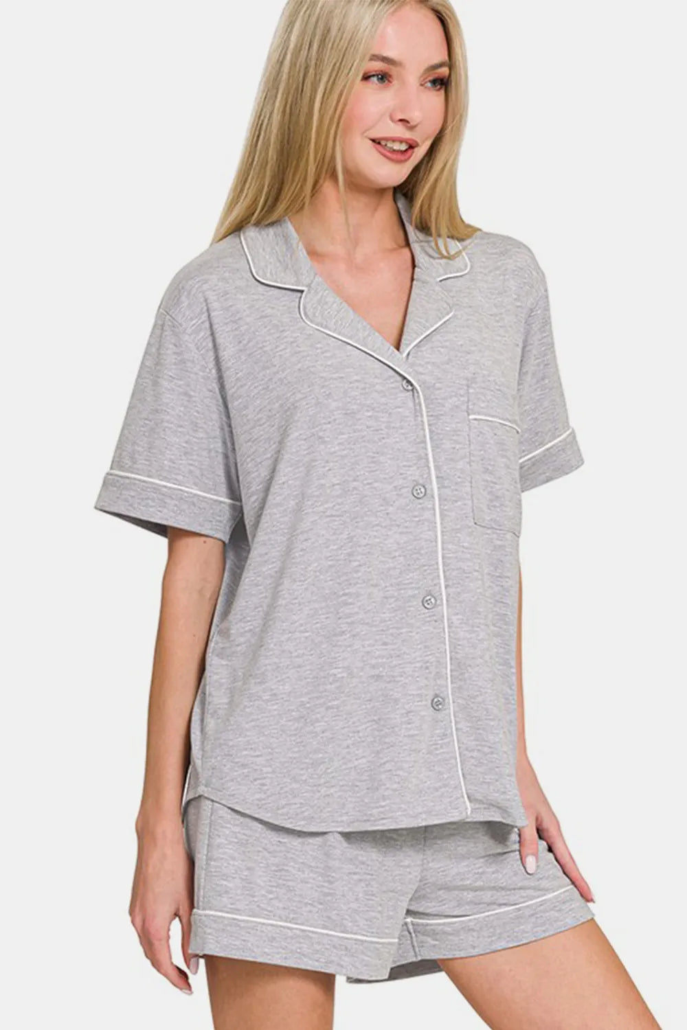 Zenana Button Down Short Sleeve Top and Shorts Lounge Set