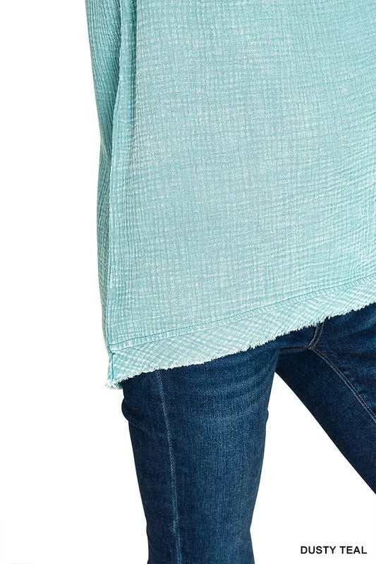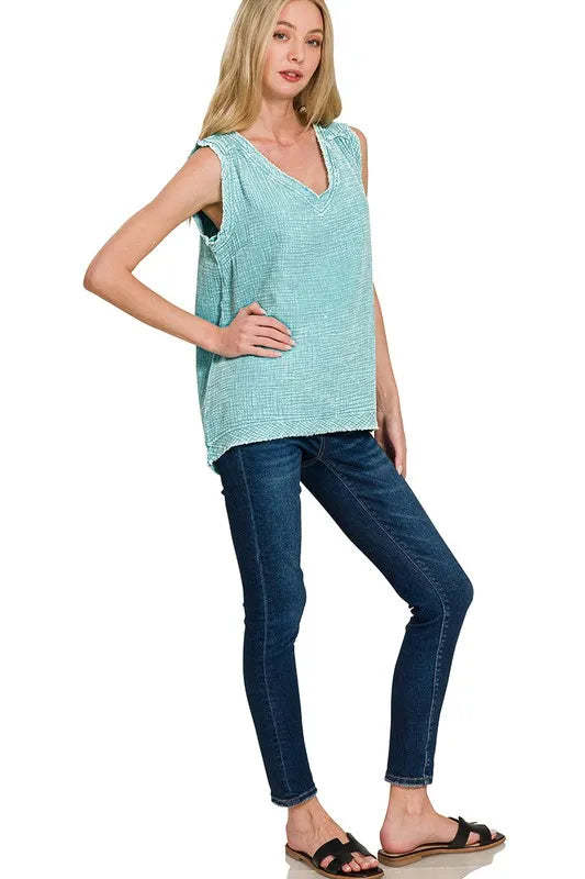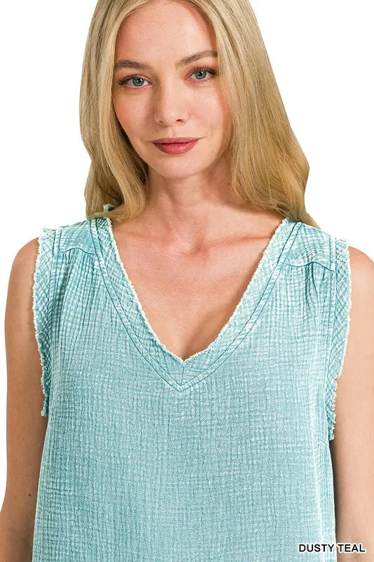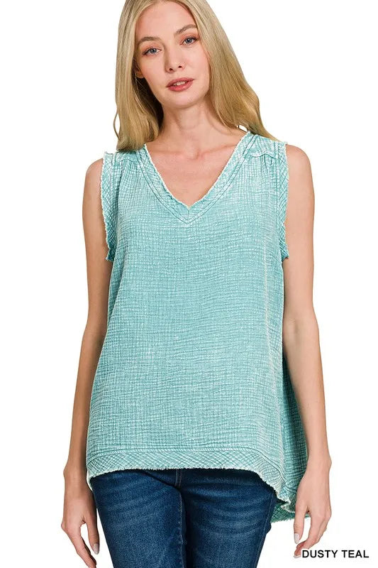A Double Gauze Raw Edge Acid Washed Tank is a trendy and fashion-forward sleeveless top made from double gauze fabric with a raw edge finish and acid-washed treatment. This tank top has a lightweight and airy feel due to the double gauze material, making it ideal for warm weather or layering. The raw edge detailing adds a distressed and casual vibe to the tank, giving it a relaxed and edgy look. The acid-washed treatment creates a unique and vintage-inspired appearance with variations in color and texture. The Double Gauze Raw Edge Acid Washed Tank is a stylish and versatile piece that can be paired with shorts, jeans, or skirts for a chic and effortless outfit.