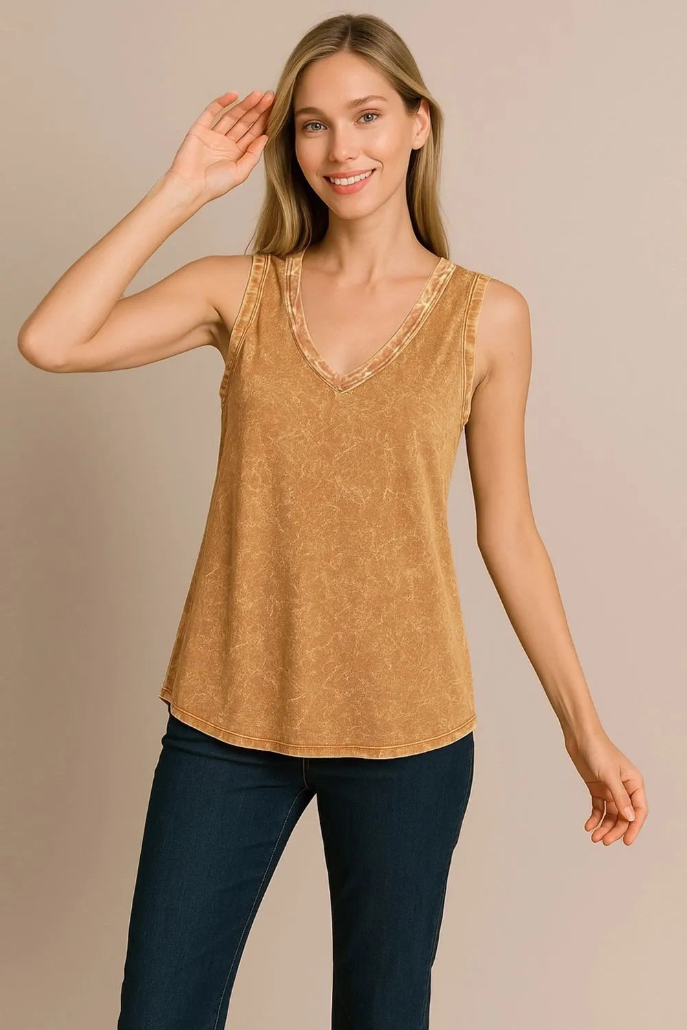 This stunning vintage-inspired tank top features a beautifully washed golden-brown fabric that offers both comfort and style. The V-neckline is adorned with intricate lace trim detailing, adding a feminine touch to this versatile piece. Made from soft, breathable material, this sleeveless top provides a relaxed, flowy fit that flatters all body types. Perfect for casual outings or dressed-up occasions, this tank can be paired with jeans, skirts, or layered under blazers. The vintage wash treatment gives each piece a unique, lived-in character while maintaining premium quality construction.