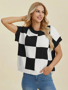 Double Take Full Size Checkered Round Neck Short Sleeve Sweater